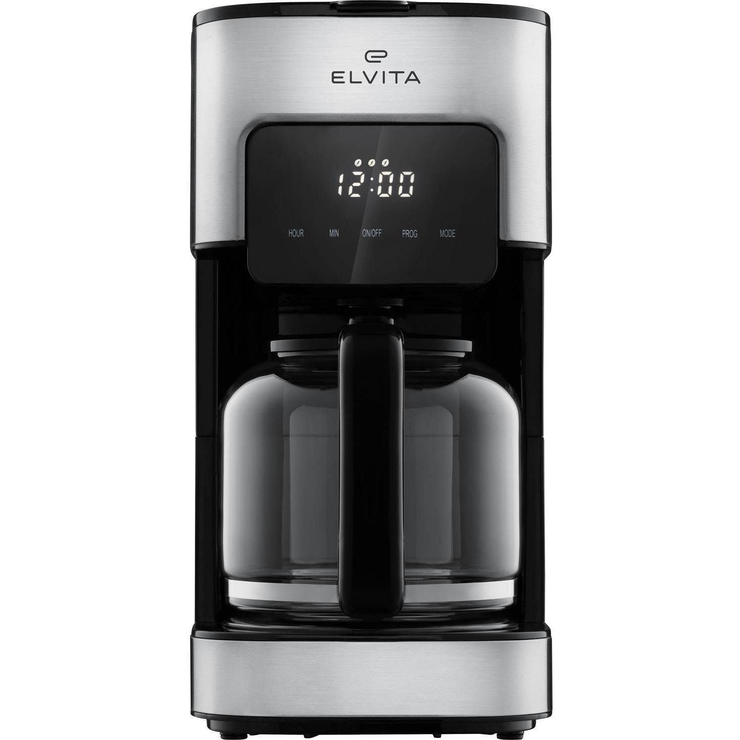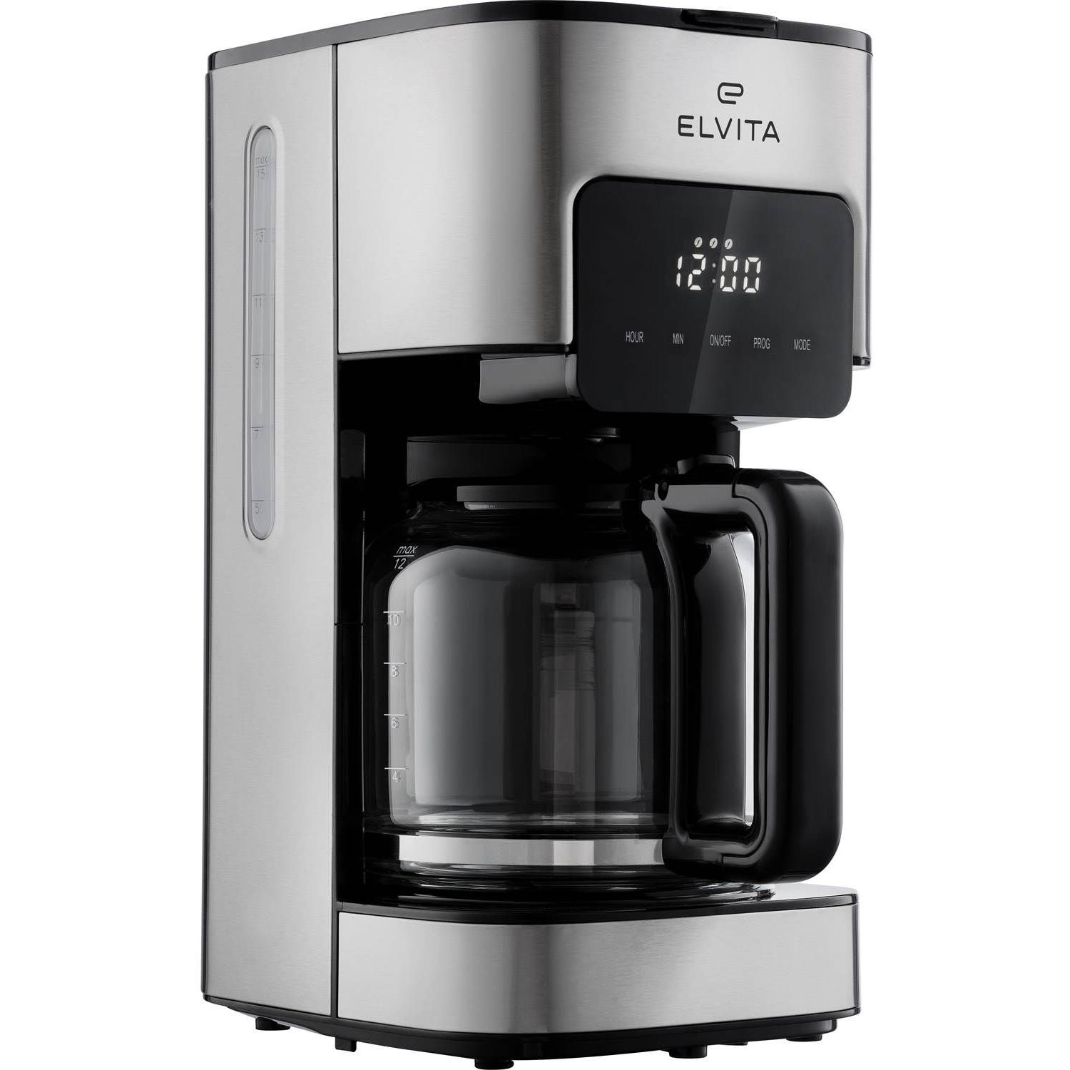 Elvita kaffemaskine CKB3900X er stilfuldt designet i sort og rustfrit stål. Den har en kapacitet på 12 kopper kaffe.