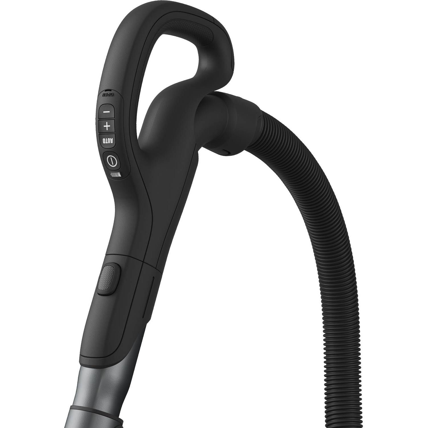 Støvsugeren har et LED-display og fjernbetjening i håndtaget, der giver dig mulighed for bekvemt at vælge effektniveau eller tilstand direkte fra håndtaget og derefter se den valgte indstilling på LED-displayet på støvsugeren.