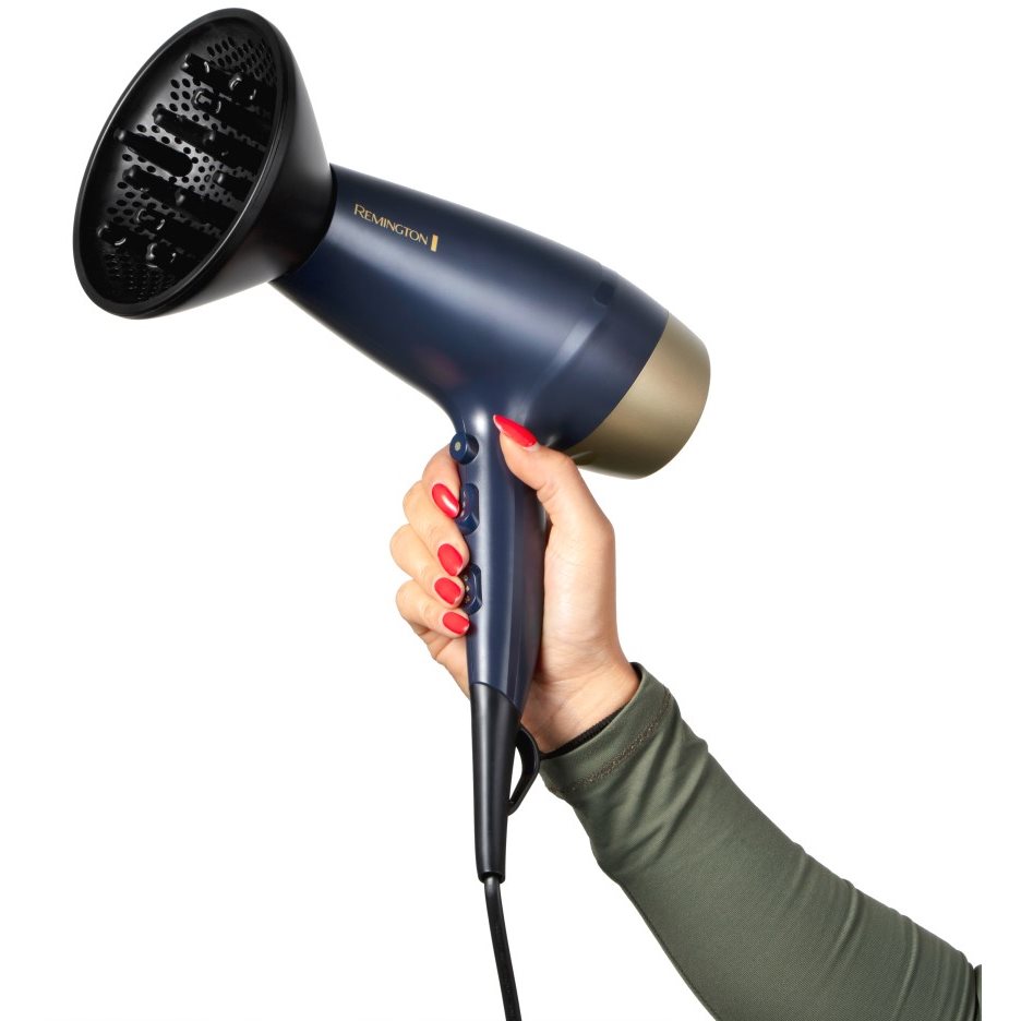 Remington Sapphire Luxe-føntørreren er designet i en dyb marineblå og champagne og ser fantastisk ud på ethvert toiletbord.